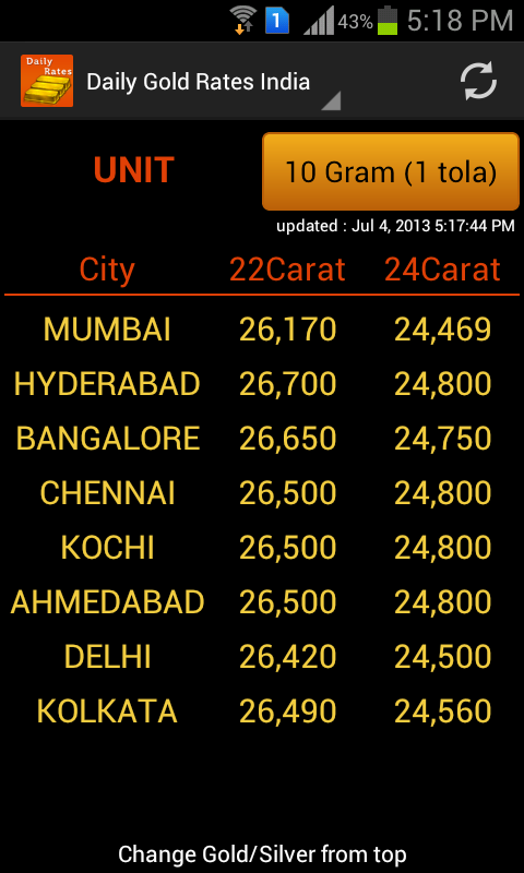 Today's Grt Gold Rate Find the latest gold rate Today: gold price per gm. Or in ounce for 24 karat gold to 22 Karat! Gold rates in metros, silver price, bullion stock quotes, gold funds. Gold Rate Today IndiaGold rate in India - Chennai, Mumbai, Delhi / Gold price. This page shows gold rate today in India. You can see ... Return Doc